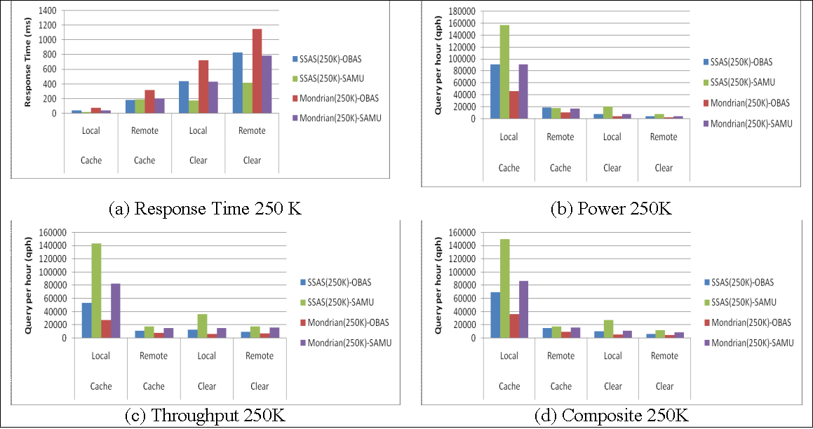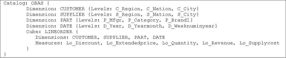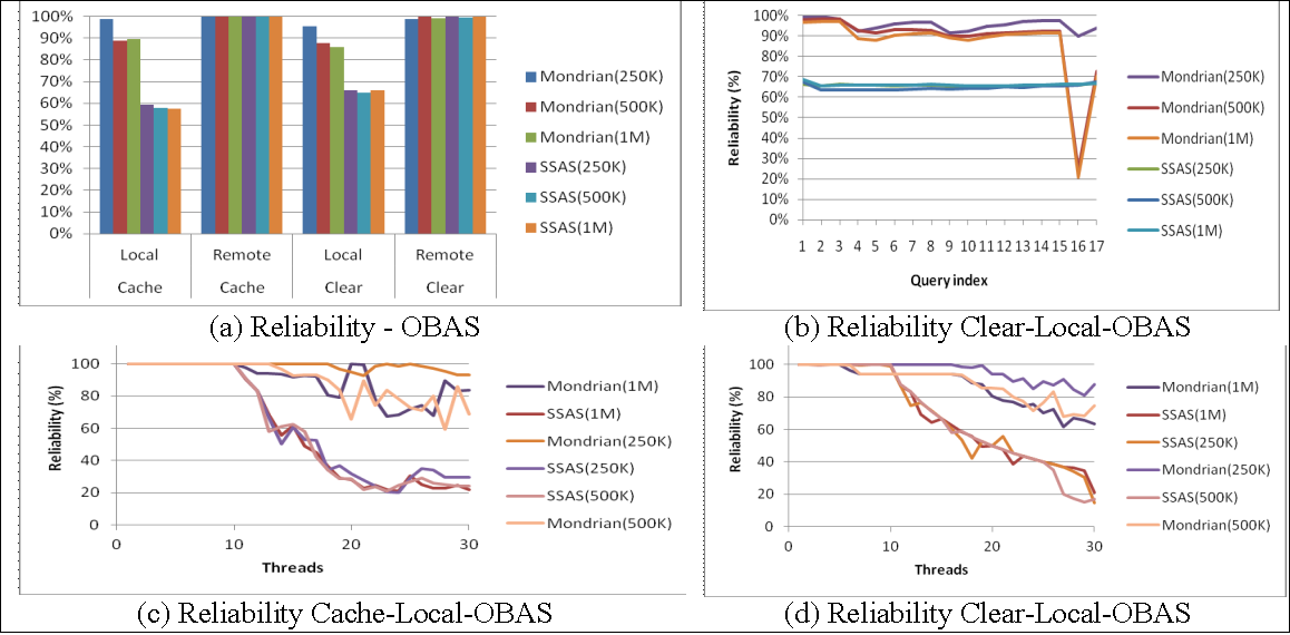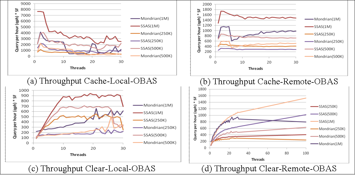 Some benchmarks have been proposed for helping in the design of data warehouse performance tests, such as TPC-H, which was extended by SSB (Star Schema Benchmark). However, we identified the lack of a benchmark for analysis services (OLAP). In this article, we specify a benchmark for analysis services, called OBAS that extends SSB's multidimensional schema and creates varying-sized data cubes. It enables the evaluation of analysis services through the specification of running configuration parameters, a set of MDX queries and a set of service performance metrics, i.e. response time, rate of execution and service reliability. Using OBAS, we compared two analysis services that adopt XMLA as communication interface: the SQL Server Analysis Services (SSAS) and the Pentaho Mondrian. The results showed that OBAS helped in the comparison of these services with respect to performance and reliability regarding the number of threads.Downloads